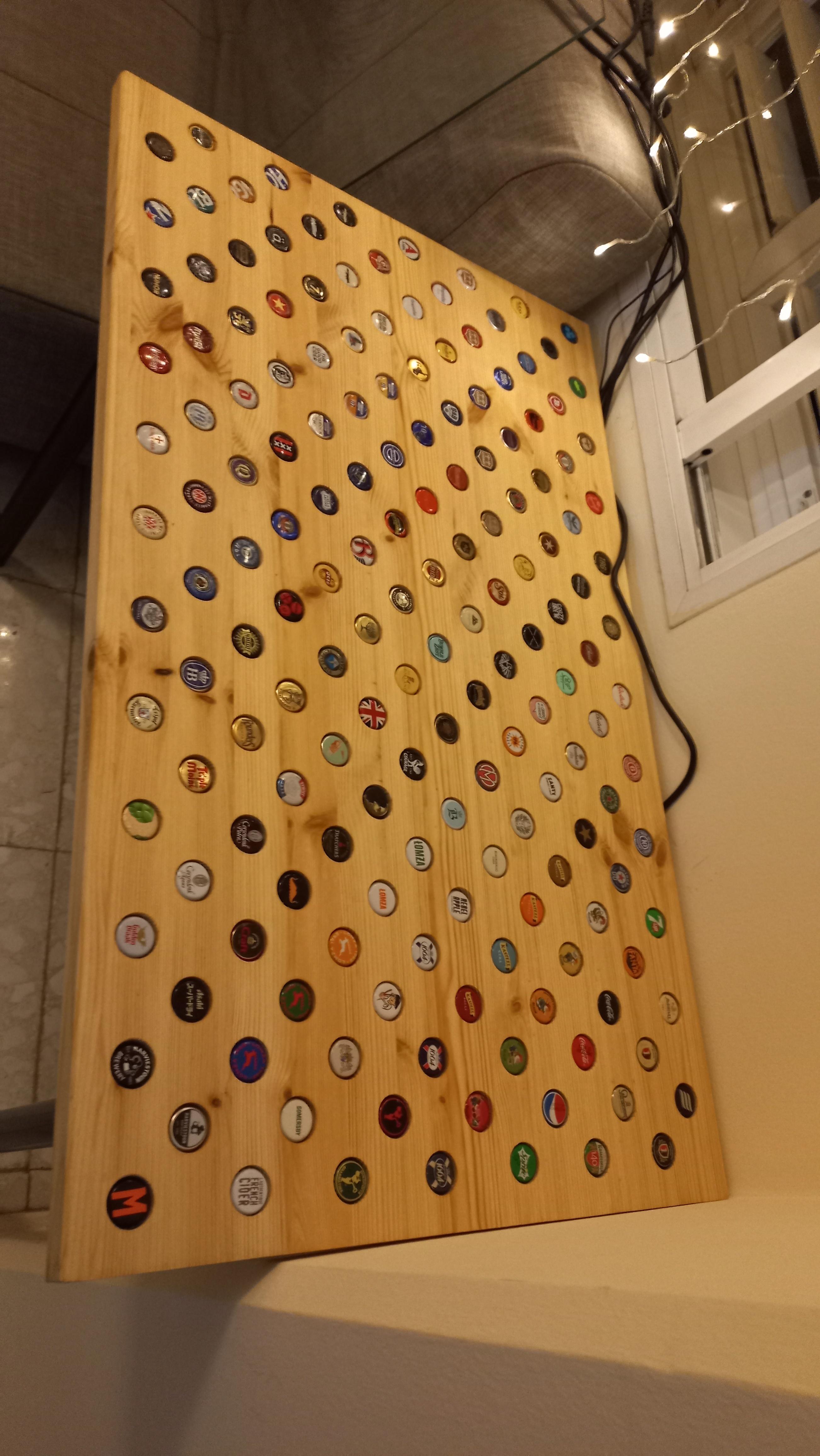 Obligatory finished product first. It is a wooden tabletop, with blind holes drilled in it to house beer bottle caps I collected this year. The glass covers the caps to make an even surface. You can say it is a display case for a collection of bottle caps doubling as a table.