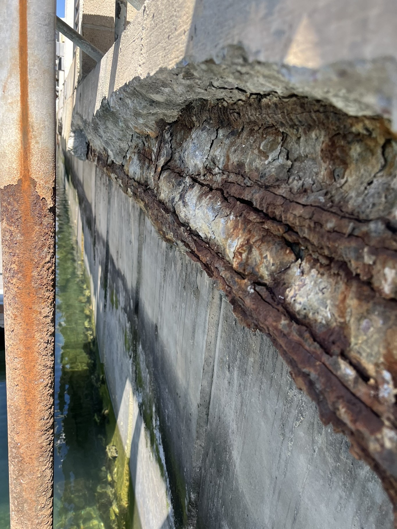 The concrete has delaminated, and the rebar inside has rusted and corroded, compromising the structure.