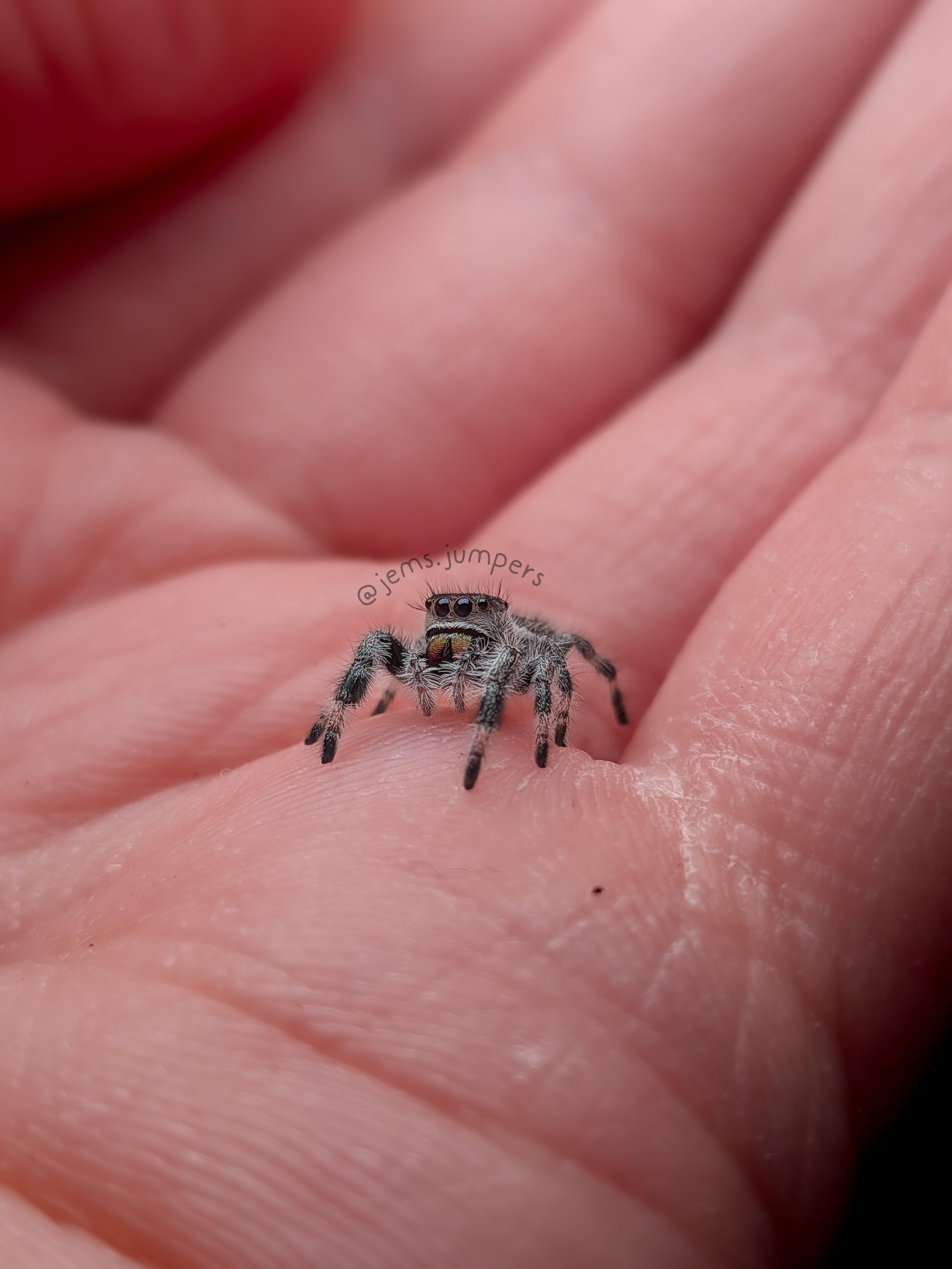 ❗FOR EDUCATIONAL PURPOSES❗Fun spood fact time! This male Phidippus Regius Bahamas, is carrying the white recessive gene. Those that carry the white recessive gene will still grow into their normal, vibrant colours. So you won’t see the gene on the outside